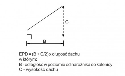 Efektywną powierzchnię dachu (w metrach kwadratowych) można obliczyć za pomocą wzoru: