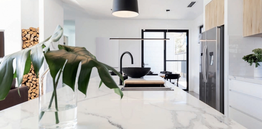 Znakiem rozpoznawczym marmuru jest charakterystyczny żyłkowany wzór. Rysunek może być bardzo wy - raźny w postaci długich „żył” lub też znacznie delikatniejszych rzadko rozsypanych i prawie niewidocznych przebarwień. Podłużne użylenia są pochodną warstwowej budowy tej skały. Marmurowi przypisana jest również jasna kolorystyka, najczęściej w odcieniach bieli, która uznawana jest za klasykę. Jego ojczyzną jest region basenu Morza Śródziemnego. Do najbardziej dekoracyjnych i szlachetnych wśród białych marmurów z pewnością należy ten pochodzący z włoskiej Carrary, który wyróżnia czysta lub jedynie pokryta delikatnymi przebarwieniami powierzchnia. Za jej sprawą wnętrze staje się nie tylko eleganckie, ale też optycznie większe i bar - dziej świetliste. Równie efektowny, chociaż mniej oczywisty może być marmur w odcieniach szarości aż po ciemny grafit, który doskonale wpisuje się w panujące obecnie trendy aranżacyjne. Szary marmur jest często bogato użyłkowany, co dodatkowo czyni go atrakcyjnym elementem wykończenia wnętrz minimalistycznych czy industrialnych. Skały w tej gamie kolorystycznej są sprowadzane m.in. z Indii oraz Hiszpanii. Do klasyki można też zaliczyć marmury w odcieniach beżu, które są nie tylko uniwersalne, ale też dodają wnętrzom ciepła i przytulności. Mniej popularne są elementy wykończenia z marmuru w kolorze żółtym, różowym czy zielonym.